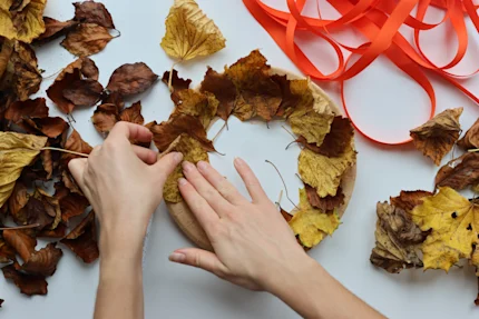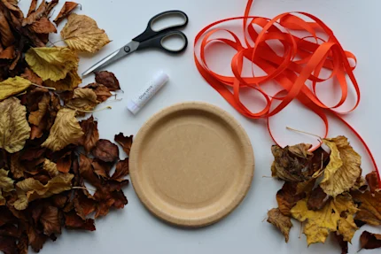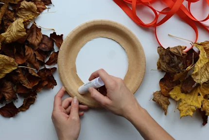 Lim blade på ringen, indtil hele kransen er dækket. Prøv forskellige mønstre som f.eks. stor-lille-stor eller rød-grøn-gul.