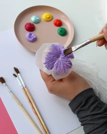 Lav jeres egne smukke blomstertryk – en sanselig og kreativ leg med farver og former. Aktiviteten er perfekt på en sommerdag i skyggen, hvor barnet kan eksperimentere frit med maling og mønstre og skabe helt unikke kunstværker.