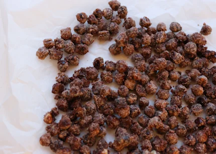Når nødderne er fint gyldne, tages de af varmen og hældes ud på bagepapir. Lad dem køle helt af.