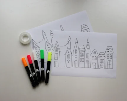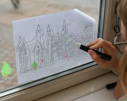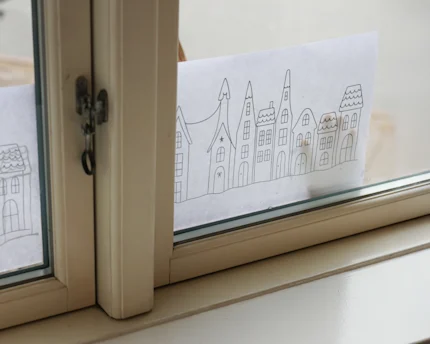 Skab jeres egen magiske julelandsby direkte på vinduet! Brug den simple skabelon som guide, og tegn små huse, tage med sne og fine detaljer. Det er en hyggelig aktivitet, hvor barnet kan være med til at gøre hjemmet ekstra vinterhyggeligt. Når I fjerner papiret bagved, står jeres helt egen landsby tilbage og spreder julestemning i ruden.