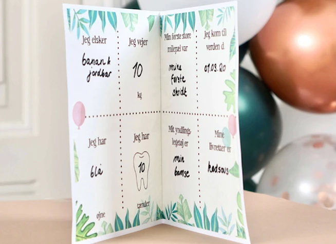 Du kan enten printe folderen og skrive info på i hånden, eller lade den være tom og sammen med dine gæster quizze om højdepunkterne fra dit barns første år.