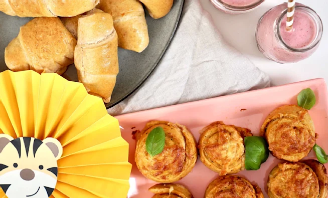 Hjemmebag, der ikke er kompliceret: lidt fuldkorn til de små og en kage, som både voksne og børn vil sætte pris på! Serveret med masser af frisk frugt og børnevenlige smoothies, så der er energi til leg og fejring hele dagen.